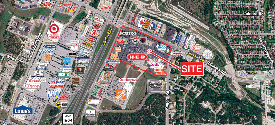 Culebra Market, anchored by HEB, is conveniently located at the southeast quadrant of W Loop 1604 and Culebra Rd. This center offers dining, health, and beauty services to the surrounding San Antonio community. For current leasing availability at Culebra Market, please see below: